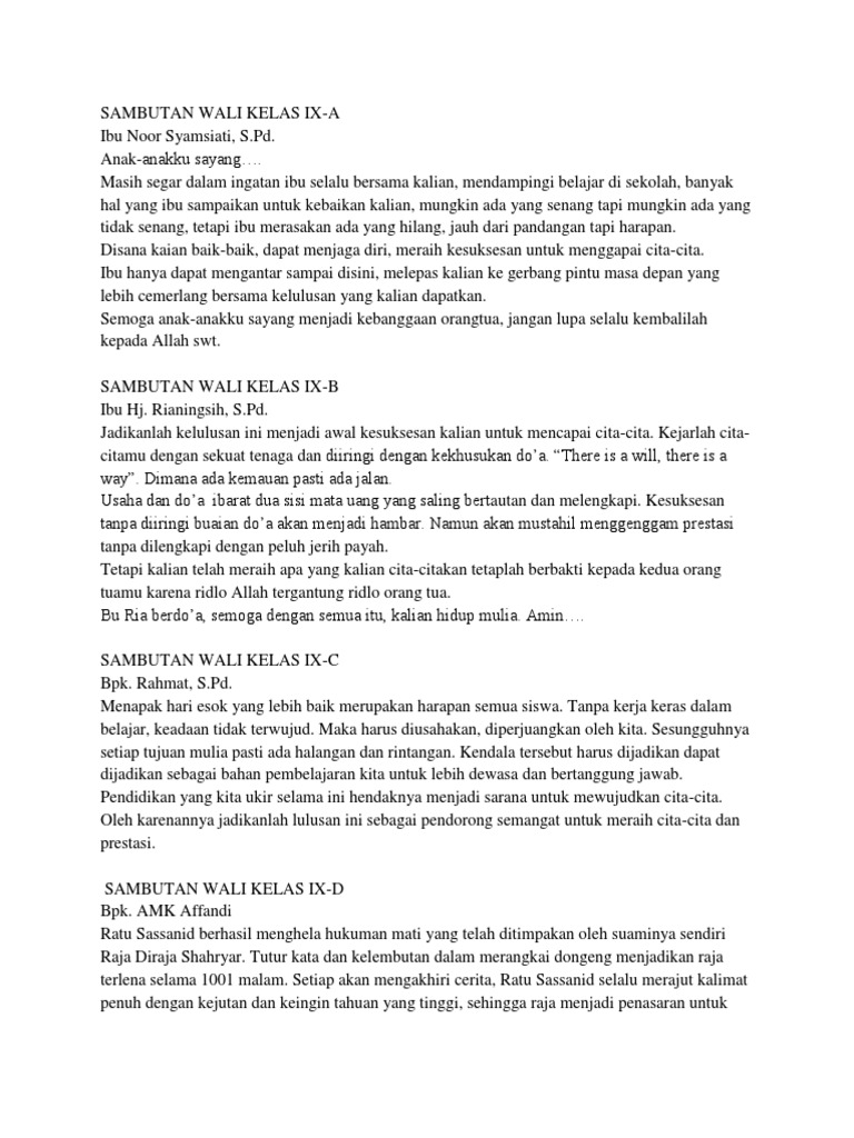 Beberapa acara yang melibatkan wali murid adalah acara pertemuan wali murid rapat wali murid perpisahan siswa siswi dan berbagai acara lainnya. Semoga Contoh Sambutan Wali Kelas Dalam Perpisahan Kelas 6 diatas dapat sedikit bermanfaat bagi semuanya. Sambutan Wali Kelas XII IPA 7.