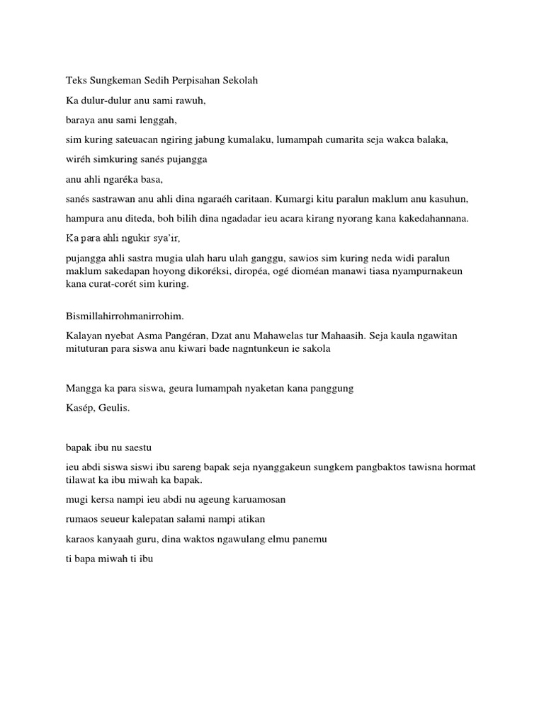 Contoh Teks Pidato Perpisahan Sekolah Bahasa Sunda dan Terjemahannya. Solawat sinareng salam mugi dikocorkeun ka jungjunan urang sadaya Nabi Muhammad saw. Kumargi kitu paralun maklum anu kasuhun.