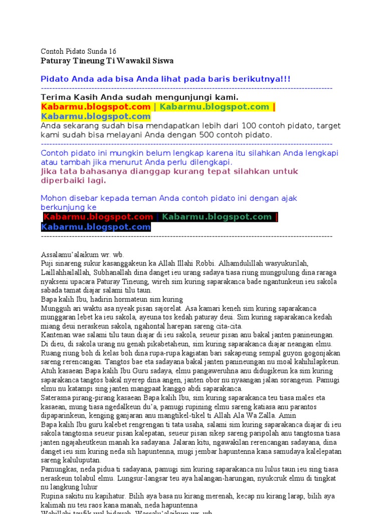Kata Lucu Bahasa Sunda. Jika kamu ingin belajar biantara pidato perpisahan dalam bahasa Sunda. Contoh Biantara Wawakil GuruKapala Sakola Waktos Paturai Tineung.