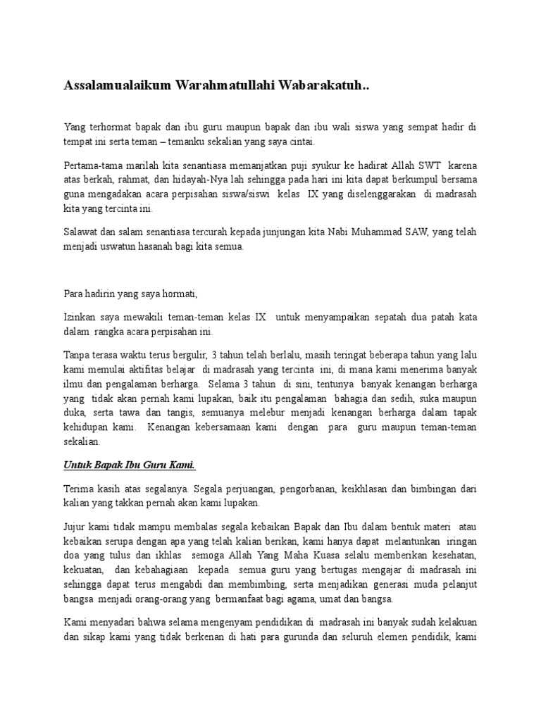 Dia yang sudah menjadi guru mengajarkanmu pelajaran dan ilmu yang menjadi penerang jalan hidup kita. Perpisahan memang dibuat untuk menjadikan pertemuan kembali terasa indah sekali. Dalam acara perpisahan sekolah dimana biasanya juga dihadiri oleh orang tuawali pasti terdapat pidato yang disampaikan oleh wakil siswa wakil orang tua wali hingga kepala sekolah sebagai wakil dari pihak sekolah.