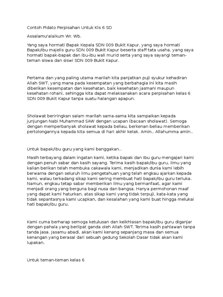 Teks Pidato Perpisahan Kelas 6. Jelaskan manfaat dari pelajaran yang sedang dipelajari sesuai dengan minat anak tersebut misalnya dengan mempelajari perkalian maka saat liburan naik kelas. Dan apabila ada kekurangan kekeliruan kata dalam penulisan sambutan perpisahan kelulusan oleh wali kelas ini kalian berhak mengedit naskah pidato ini atau menambahkan kata-kata agar lebih baik dan lebih sempurna lagi menurut kalian.